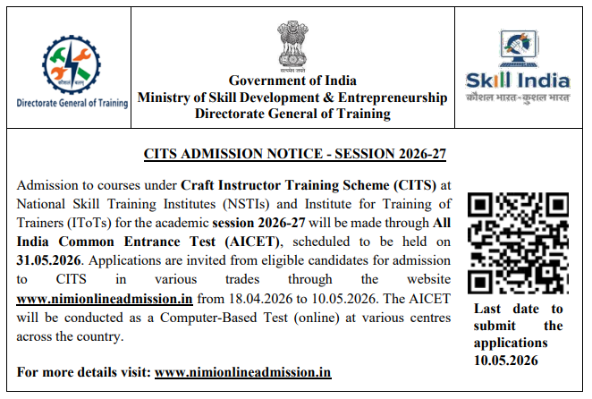 • Course Name : Admission for Craft Instructor Training Course through All India Common Entrance Test 2026.