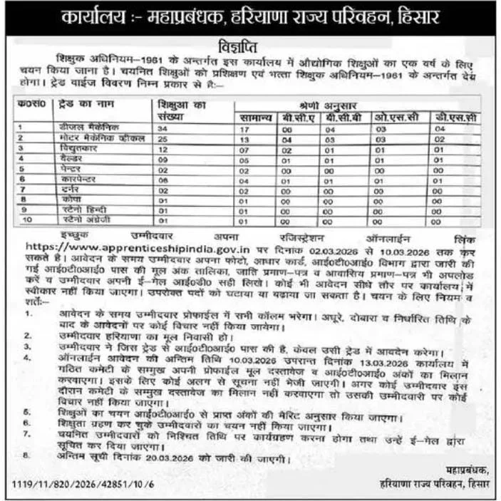 Transport Department Haryana, Hisar (HR)Hisar Roadways Apprentice Recruitment 2026Short Details of Advertisement NotificationWWW.SARKARINETWORK.COM |