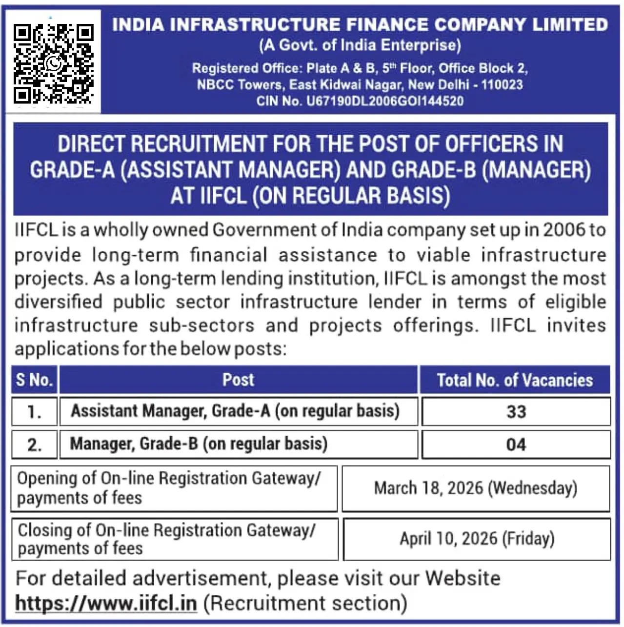 IIFCL Assistant Manager, Manager Vacancy 2026 : Get complete details about IIFCL Assistant Manager, Manager Recruitment 2026, including recruitment updates, total vacancies, important dates, application fees, eligibility criteria, age limit, selection process, salary, syllabus, exam pattern, admit card, answer key, result, and more.