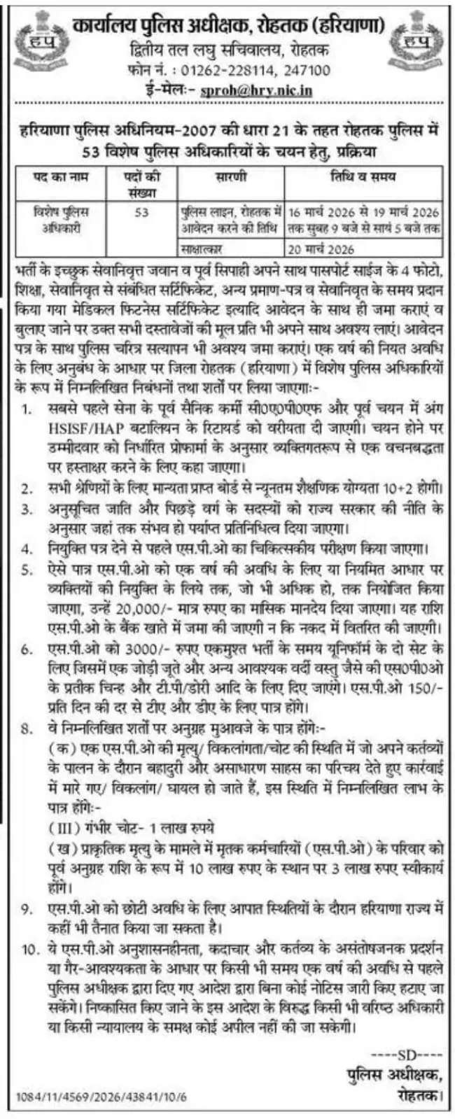 - रोहतक पुलिस SPOs पदों के लिए दिनांक 16/03/2026 से 19/03/2026 तक समय सुबह 9 बजे से शाम 5 बजे तक व्यक्तिगत रूप से पुलिस लाइन, रोहतक में आवेदन स्वीकार किए जाएंगे।